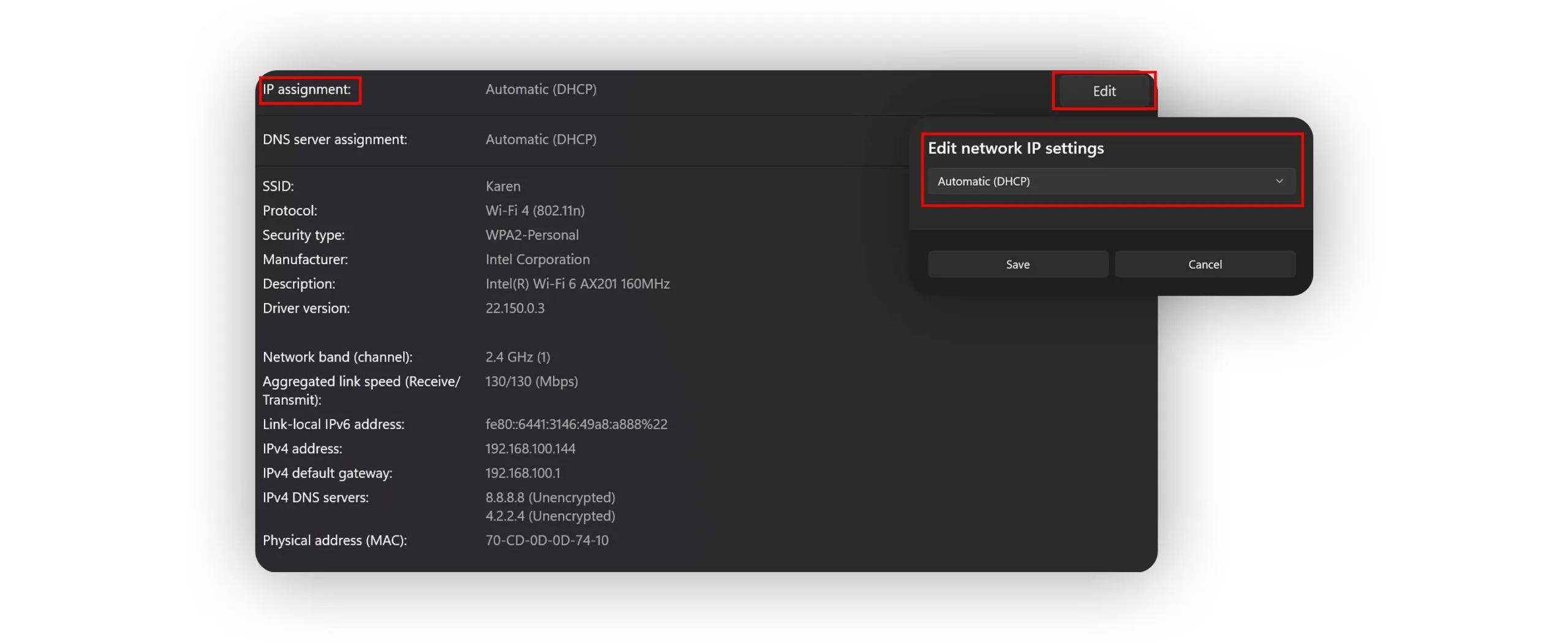 - در قسمت IP settings بررسی کنید که تنظیمات روی Automatic (DHCP) قرار گرفته باشد.