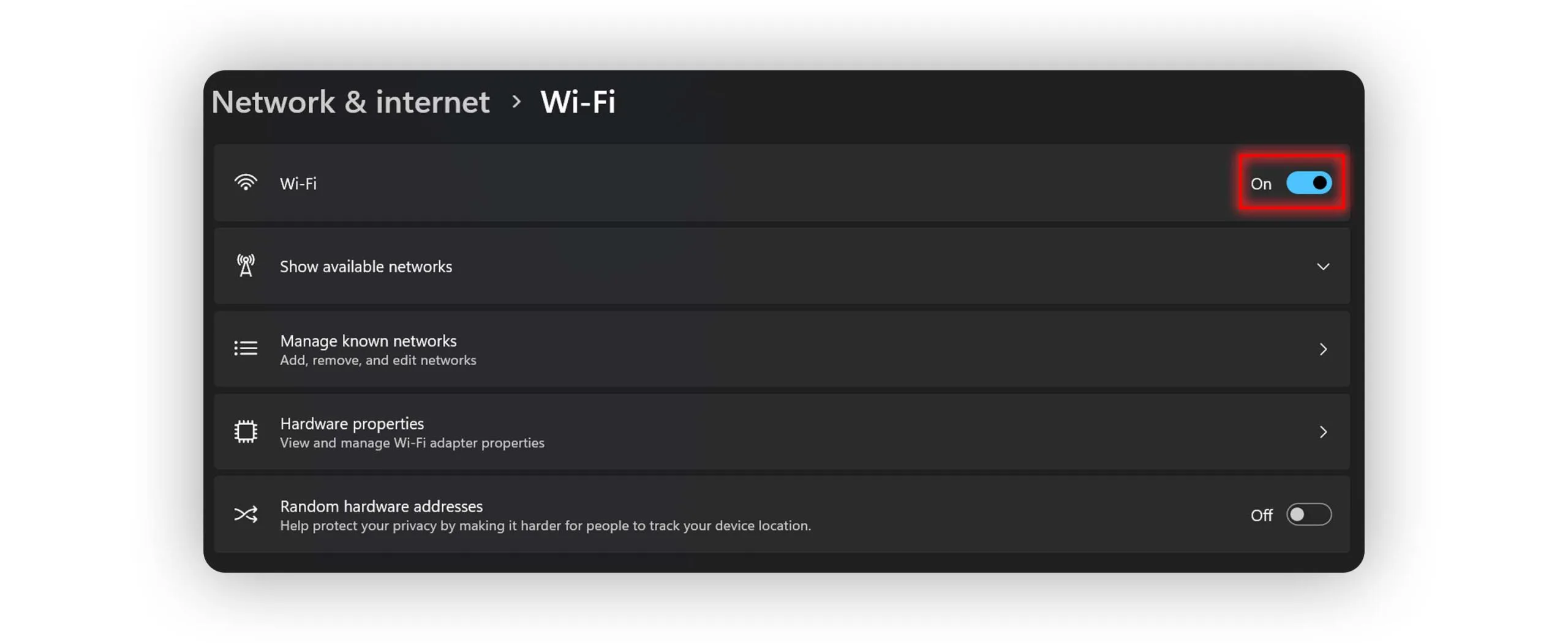 - پس از فعال شدن آداپتور، دوباره به تنظیمات وای فای در ویندوز برگردید و بررسی کنید که گزینه وای فای در دسترس است یا خیر.
