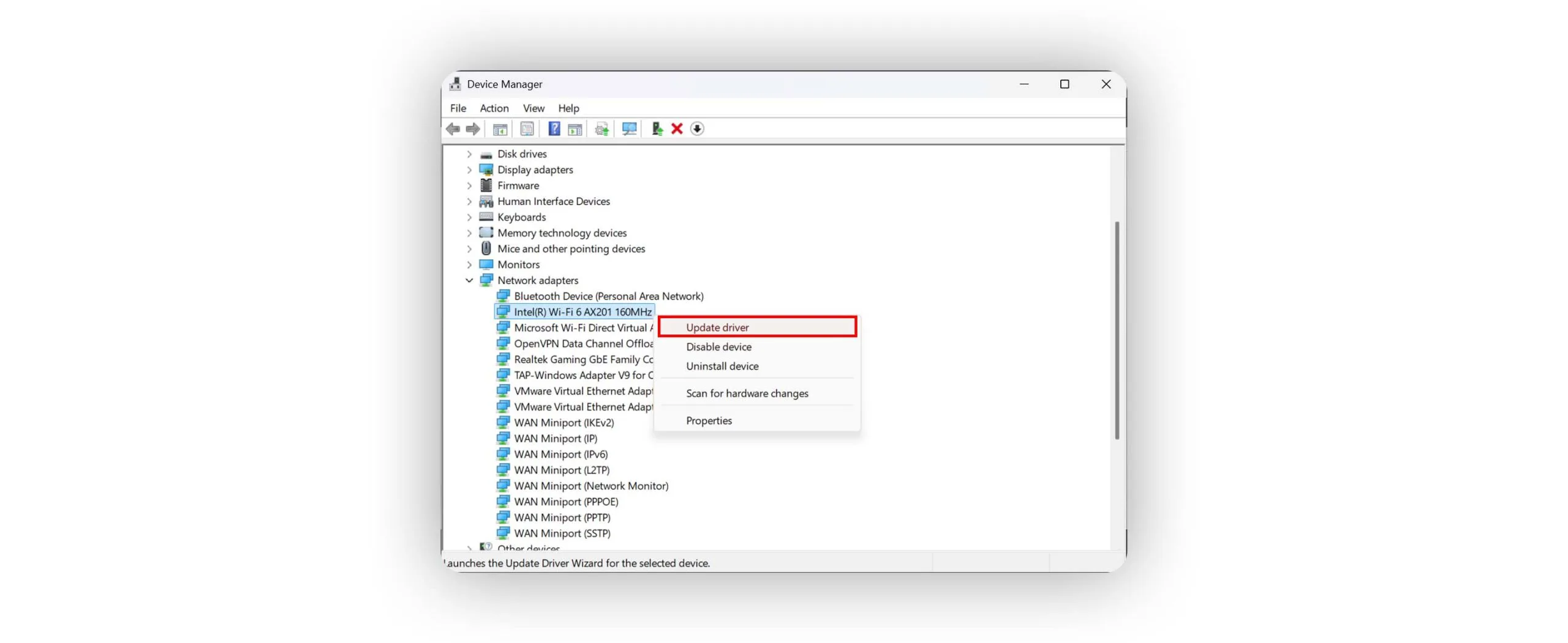 - در بخش Network Adapters، روی آداپتور وای فای راست کلیک کرده و گزینه Update driver را انتخاب کنید.