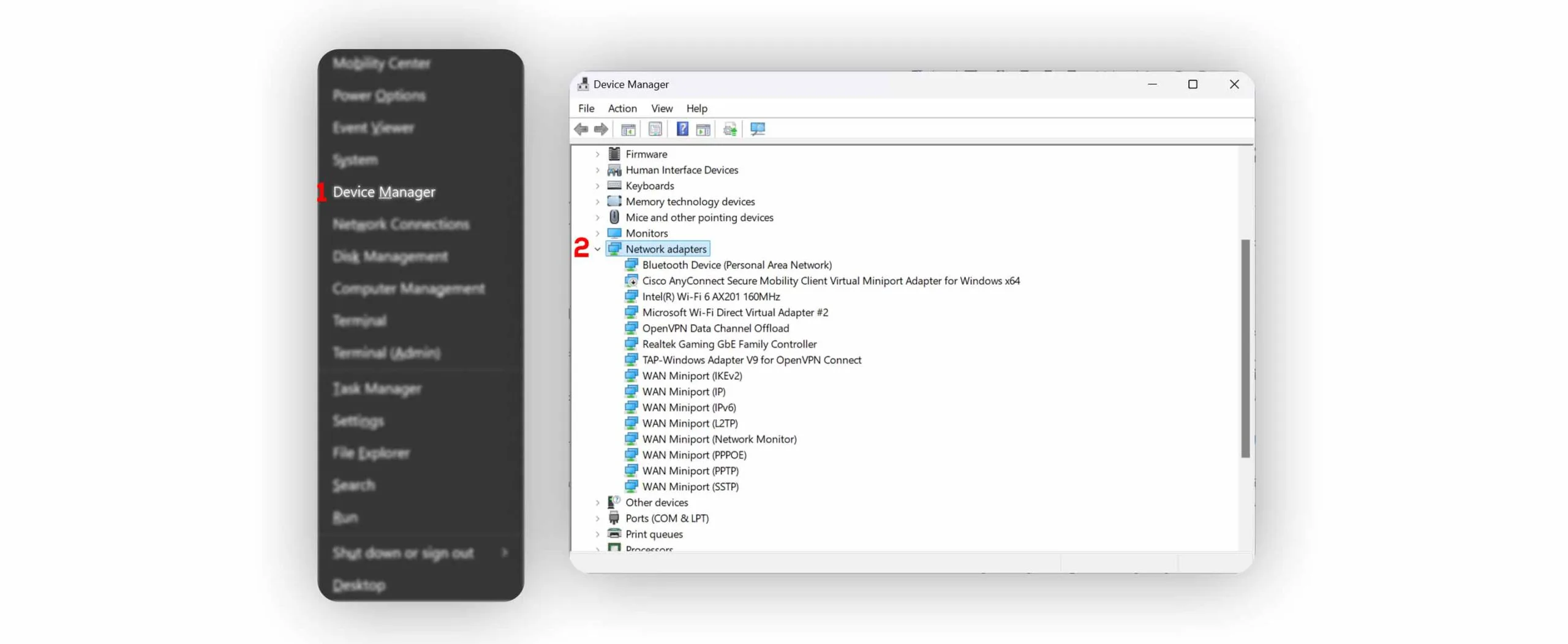 راهکار:- ابتدا از کلیدهای ترکیبی Win + X استفاده کنید و گزینه Device Manager را انتخاب کنید. در این بخش، روی گزینه Network Adapters کلیک کنید تا لیست کارتهای شبکه نمایش داده شود.